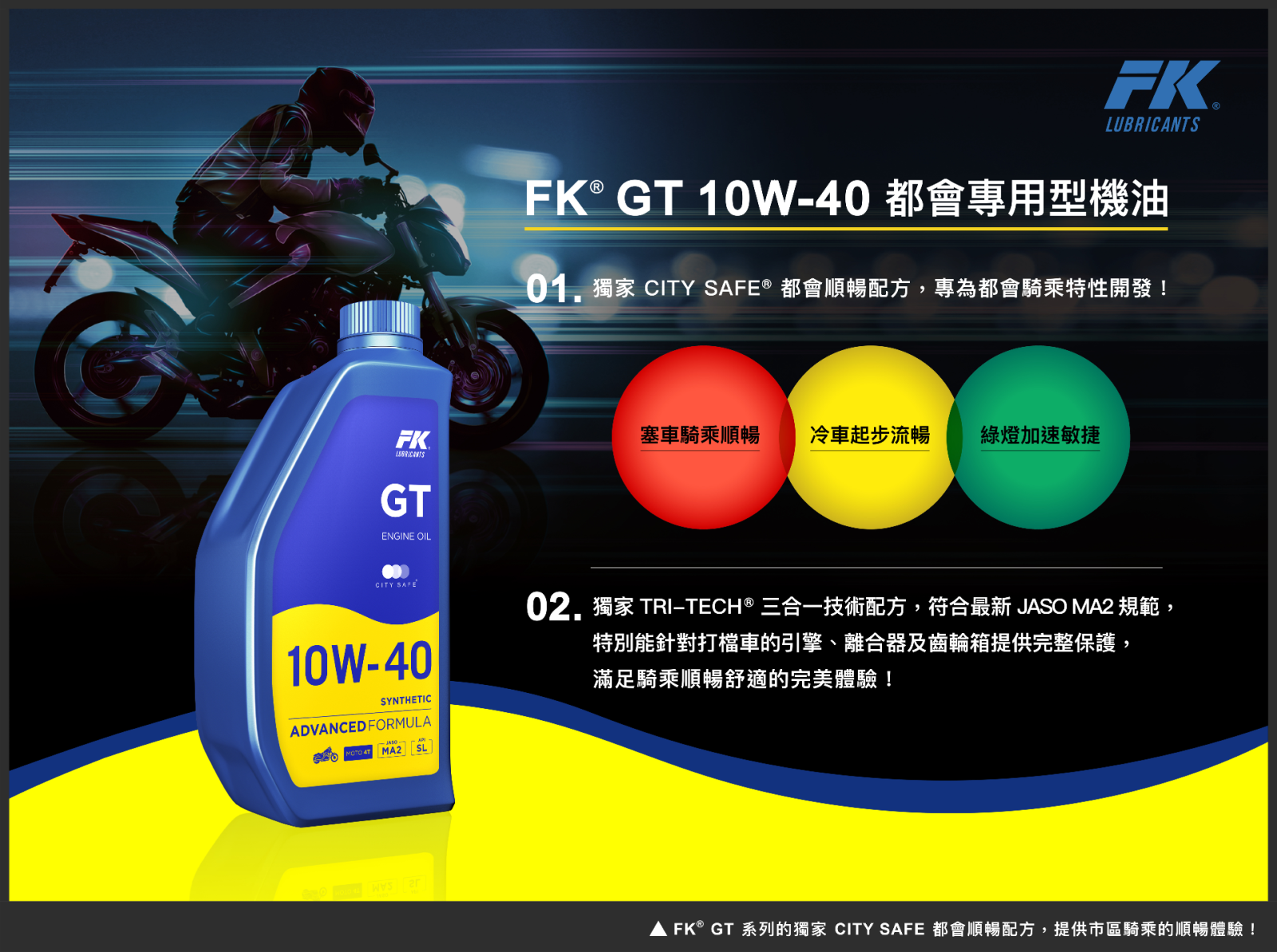 FK® 潤滑油本次活動所贈送的 GT 10W-40 為 GT 系列成員之一,全系列均符合最新 JASO MA2 認證,並採用獨家 CITY SAFE® 順暢都會配方,是專門針對市區壅塞、悶熱環境所研發,特別適合機車通勤族及承重載貨需求的外送員所使用,提供騎乘舒適順暢、載重扭力充沛的優異體驗,無論是檔車或速克達都適用。