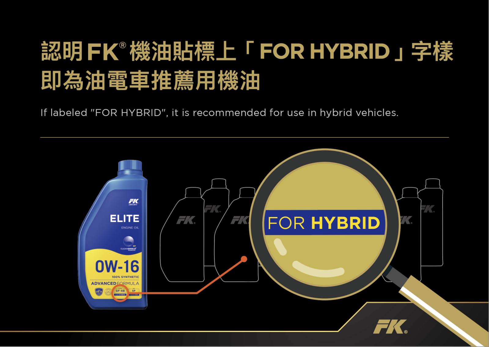 榮獲台灣精品獎兩次肯定的 FK® 潤滑油,長期關注環保議題與車廠研發趨勢,油電車雖然成為許多新車主的首選,然而油電車大多使用低黏度機油,加上頻繁的引擎啟停及純電模式行駛,導致內燃機溫度較傳統內燃機低,容易造成燃油與水份揮發不全,加速機油劣化,對引擎產生嚴重的影響,FK® 兩大系列汽車機油(一般車款使用的 ELITE 系列/歐系車專用的 EURO 系列)均有針對油電車引擎特性,開發出適合油電車使用的機油,性能表現優於競品及國際規範 (註1),認明 ELITE、EURO 系列機油貼標上的「FOR HYBRID」字樣,即為油電車推薦使用的機油。(請參閱車主手冊確認適用的機油規格)